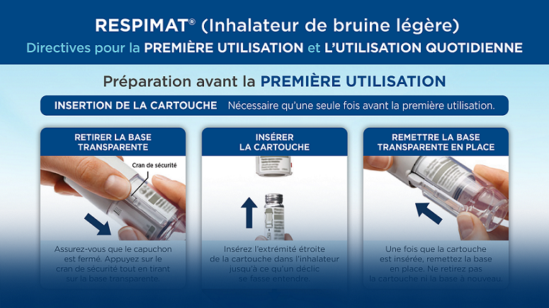 Questions : Est-ce que l'inhalation de votre médicament au moyen de l'inhalateur RESPIMAT (inhalateur de bruine légère) était facile? Est-ce que la cartouche de l'inhalateur RESPIMAT (inhalateur de bruine légère) était facile à insérer?